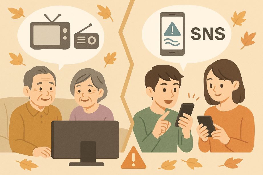 災害時にはテレビやラジオを主な情報源とするケースが多く、スマートフォンやSNSで即座に情報を得る若年層と比べて遅れが生じやすい。